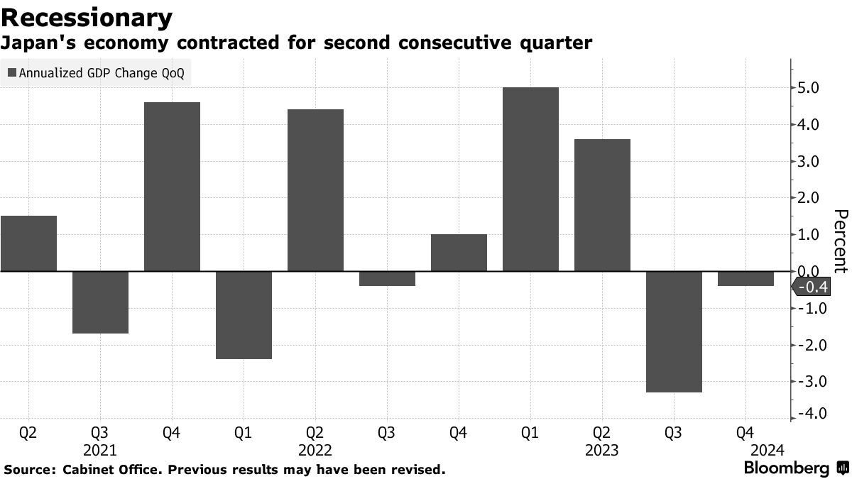По предварительным данным правительства Японии, в четвёртом квартале 2023 г. валовой внутренний продукт (ВВП) Японии снизился на 0,4% по сравнению с предыдущим кварталом. Это уже второй квартал технической рецессии для японской экономики.