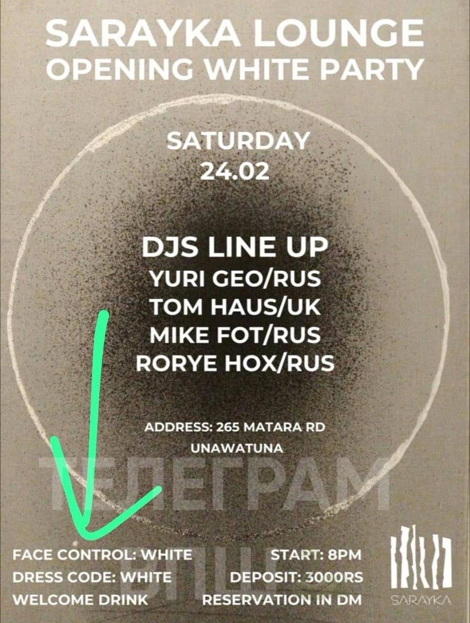 24 августа 2023 года на Шри-Ланке в одном из русских баров прошла вечеринка «Opening White Party», которая вызвала общественный резонанс. Вечеринка была заявлена как мероприятие для «только белых», что вызвало возмущение и критику в обществе. Руководство клуба быстро отреагировало и приняло решение отменить мероприятие, а также принести извинения за инцидент, заявив, что они «никогда не поддерживали и не будут поддерживать различные расистские организации или высказывания».