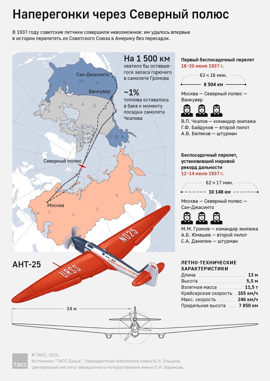 Командир экипажа рекордного полёта в Америку, который состоялся в июле 1937 г. Экипаж Громова пролетел 10148 километров за 62 ч 17 мин. Это был первый перелёт из СССР в США, через Северный полюс. За этот полёт Громов был удостоен звания Героя Советского Союза. Успешный перелёт сделал его одним из самых известных лётчиков мира.