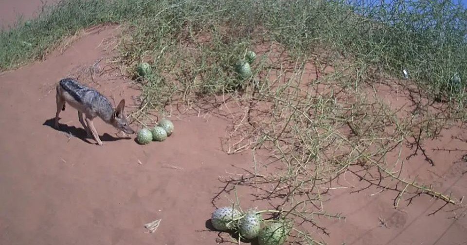 Недавно зоологи обнаружили интересный факт: чепрачные шакалы, обитающие в пустыне Намиб, имеют странную привычку — они съедают мякоть спелых плодов нары и распространяют семена с помощью своего помёта.
