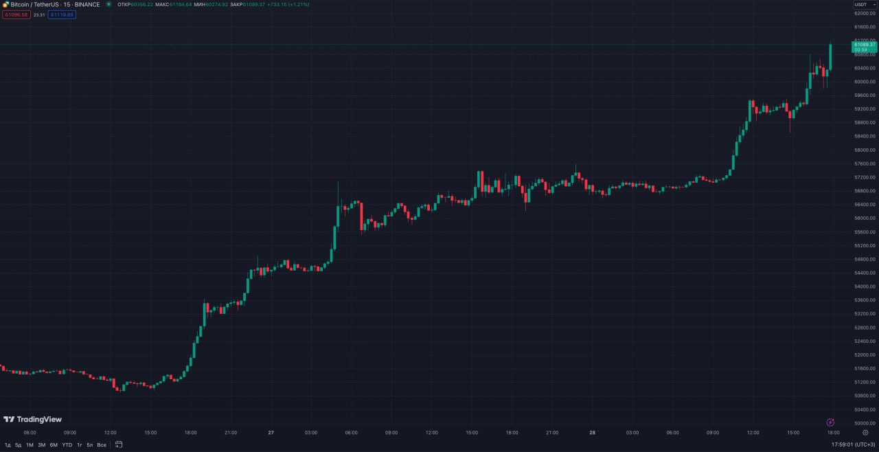 Курс биткоина превысил отметку в 61 тысячу долларов