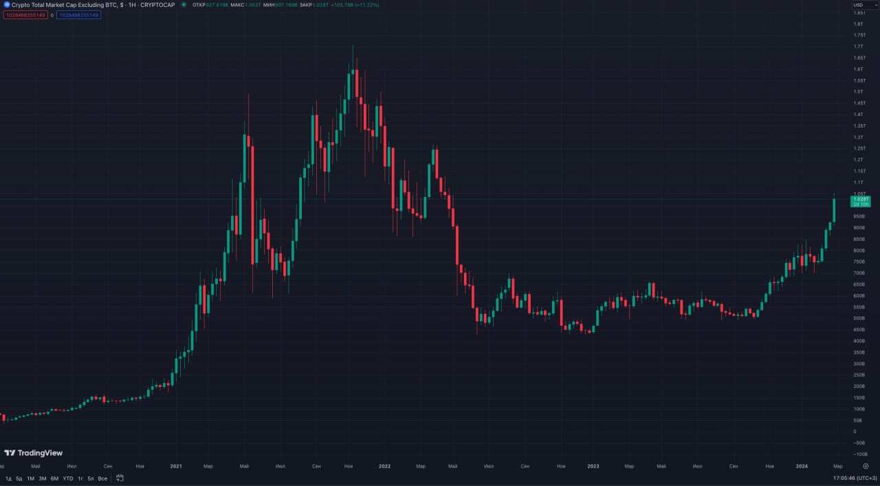 Максимальная общая капитализация альткоинов достигала $1,7 трлн в 2021 году, на пике криптовалютного рынка. Этот пик был связан с быстрым ростом криптовалют, в частности, с появлением новых проектов и токенов. Однако после этого рынок испытал спад и волатильность, что привело к снижению общей капитализации.