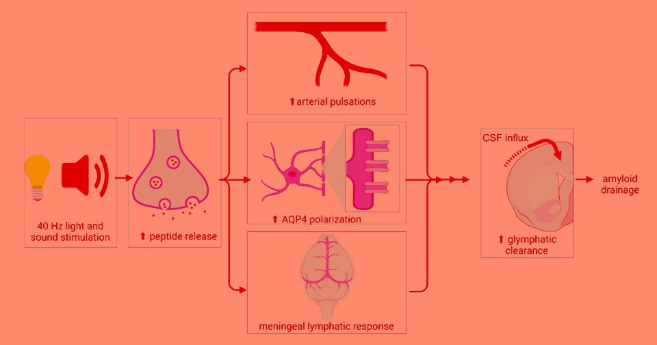 Исследователи из США определили, как стимуляция мышей звуком и светом частотой 40 Гц влияет на уровень бета-амилоидных бляшек в мозге. Они предположили, что процесс связан с улучшением когнитивных функций у мышей. Ученые продемонстрировали, что воздействие света и звука вызывает синтез пептидов, которые регулируют отток и приток жидкости в коре головного мозга. Это помогает клиренсу (очищению) бета-амилоидов.