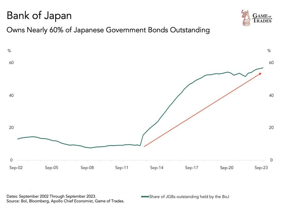 Владение Банком Японии 60% японских государственных облигаций означает, что он имеет значительную власть над финансовыми рынками и может влиять на процентные ставки и обменный курс. Например, если Банк Японии решит увеличить свою долю в гособлигациях или продать их, это может привести к изменениям на финансовых рынках и повлиять на стоимость активов и кредитов в стране.