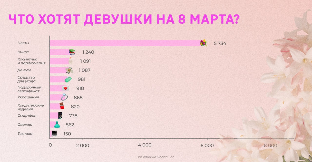 Согласно исследованию компании Sidorin Lab, более чем в 10 тысячах постов пользовательницы социальных сетей писали о том, какие подарки они хотели бы получить на 8 марта.