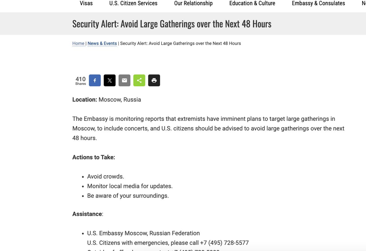На сайте посольства появилось предупреждение о возможном нападении экстремистов на большие скопления людей в Москве. Дипломаты рекомендуют избегать толп и следить за новостями. Редакция может добавить этот текст на сайт в виде статьи или заметки. Вот несколько идей, которые можно использовать в качестве вступления: Экстремисты могут атаковать в любое время. Экстремисты не имеют четкого графика и могут напасть на людей в любое время и в любом месте. Поэтому важно сохранять бдительность и осторожность. Москва — это столица России, поэтому она является привлекательной целью для экстремистов. В Москве находится множество достопримечательностей, культурных объектов и мест, где люди могут собираться. Это делает город привлекательной целью для атаки. В последние годы в Москве произошло несколько инцидентов, связанных с экстремизмом. В столице было совершено несколько нападений, включая теракты и нападения на почве ненависти. Эти инциденты подчеркивают необходимость быть осторожным и бдительным.Вот несколько идей для основной части текста: Предоставить более подробную информацию о том, какие мероприятия и места могут быть целью атаки. Например, посольство предупреждает о возможности нападения на концерты, митинги, демонстрации, религиозные службы и другие массовые мероприятия. Также можно упомянуть, что экстремисты могут использовать разные методы нападения, включая насилие, поджоги и взрывы. Рассказать о том, как можно защитить себя и других людей. Посольство рекомендует следить за обстановкой и избегать толп. Можно также упомянуть о важности того, чтобы быть бдительным и осторожным, особенно в общественных местах. Подчеркнуть важность своевременного реагирования на новости и информацию. Экстремисты часто используют социальные сети и другие средства массовой информации для распространения своих идей и призывов к насилию. Поэтому важно следить за новостями и информацией, чтобы быть в курсе последних событий и тенденций.Вот пример, как эти идеи можно реализовать в тексте:Вот некоторые рекомендации, которые помогут вам защитить себя и своих близких от возможных атак экстремистов:1. Следите за обстановкой в городе и избегайте мест, где может быть большое скопление людей.2. Будьте бдительны и осторожны, особенно в вечернее и ночное время.3. Если вы видите что-то подозрительное или слышите что-то тревожное, немедленно сообщите об этом в полицию или в службу спасения.4. Следуйте указаниям властей и сотрудников правоохранительных органов.5. Оставайтесь дома, если это возможно, или перейдите в безопасное место.6. Сохраняйте спокойствие и не поддавайтесь панике.7. Если у вас есть оружие, используйте его только в случае крайней необходимости и только для защиты себя и других.8. Не участвуйте в конфликтах и не вступайте в споры с экстремистами.9. Немедленно покиньте место происшествия, если вы стали свидетелем или участником нападения.10. Если вы получили травму, обратитесь за медицинской помощью.Не игнорируйте предупреждения и рекомендации посольств. Экстремисты будут использовать любую возможность, чтобы нанести вред людям. Будьте осторожны и бдительны, особенно сейчас, когда ситуация в стране и мире может быть непредсказуемой.