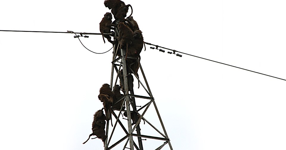 Обезьяны-анубисы на опоре линий электропередачи (ЛЭП) в Кении