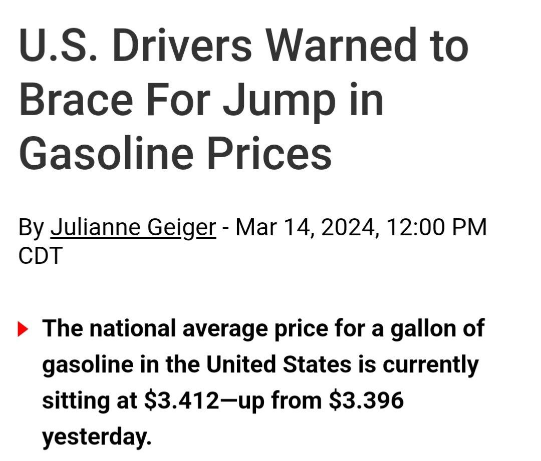 Цены на бензин продолжают расти в США в то время, когда страна готовится к автомобильному сезону и президентским выборам в 2024 году. Средняя стоимость галлона бензина в США сейчас составляет 3,412 долларов, что на 4,8% превышает цену, зафиксированную месяцем ранее.