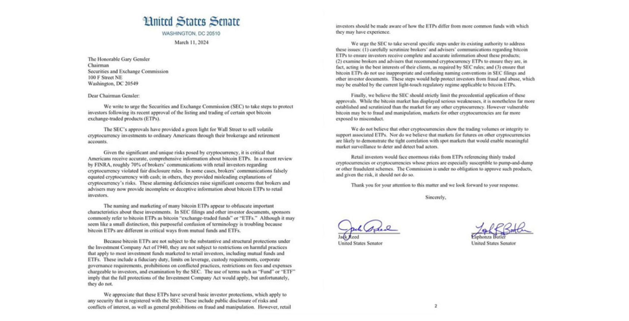 Сенаторы от Демократической партии США выступают за прекращение одобрения биржевых фондов (ETF), связанных с криптовалютами, другими словами, они призывают Комиссию по ценным бумагам и биржам США (SEC) не одобрять новые криптовалютные ETF в будущем. Это заявление может иметь серьезные последствия для индустрии криптовалют.