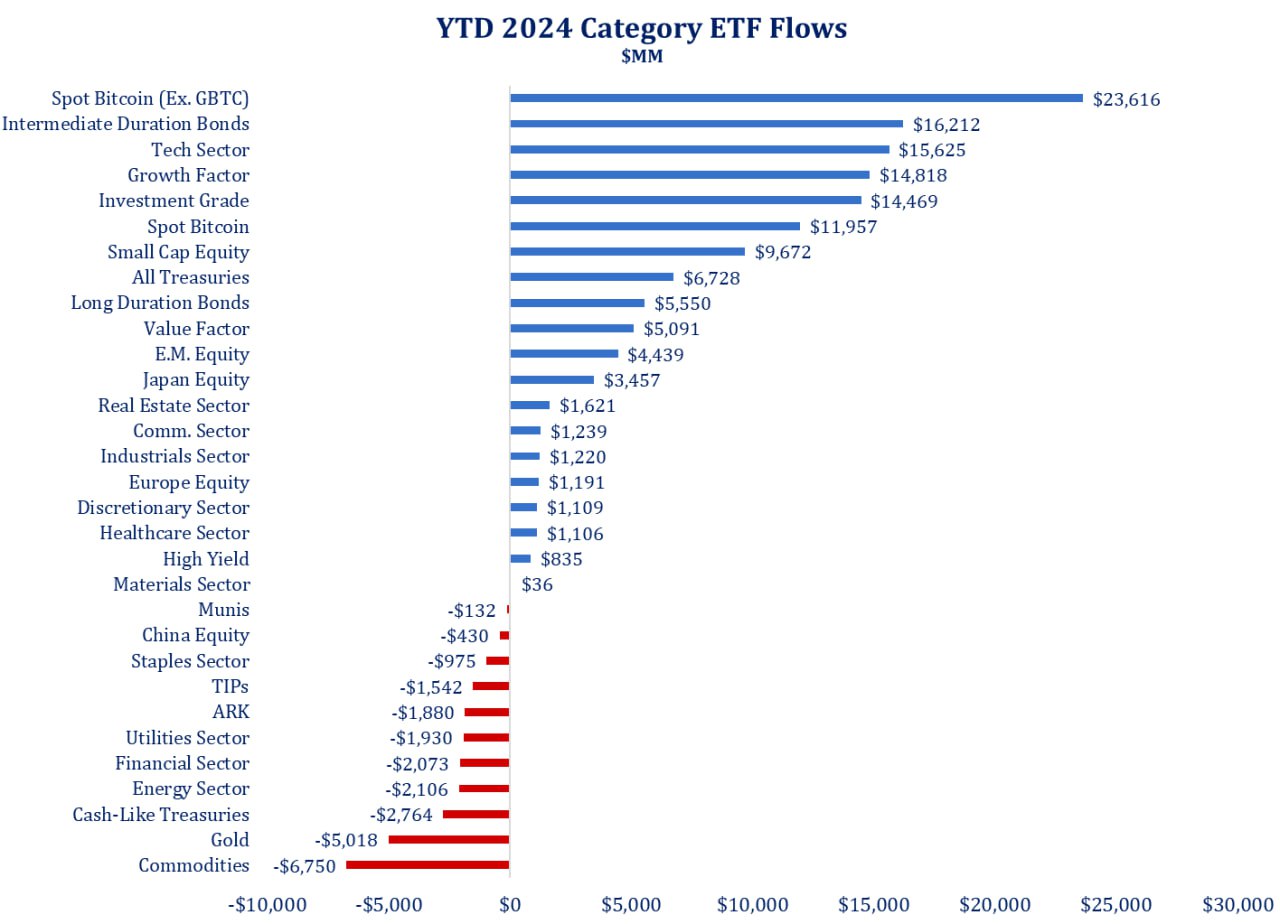 Согласно данным Strategas Asset Management и SoSoValue, криптовалютные биржевые инвестиционные фонды (ETF) привлекли более 23 миллиардов долларов в первой половине 2023 года, в то время как ETF, ориентированные на среднесрочные облигации и золото, зафиксировали отток средств, превышающий 5 миллиардов долларов и 6 миллиардов долларов соответственно.