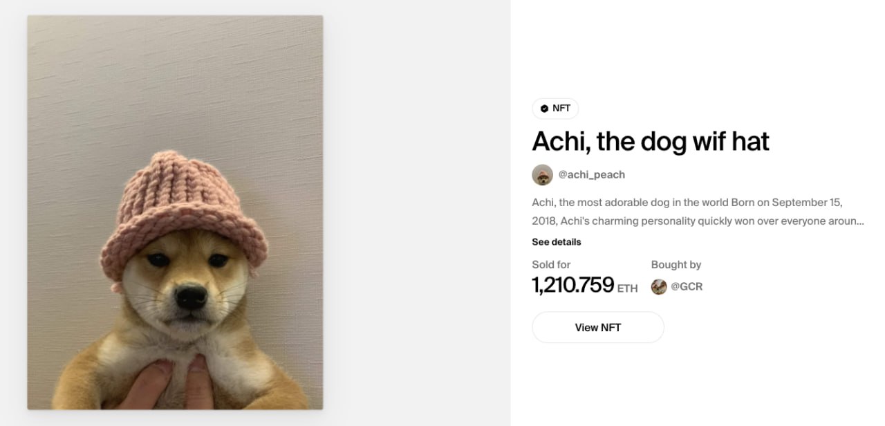 NFT-фотография собаки-маскота Ачи стала причиной небывалого ажиотажа на рынке криптовалют. Вдохновлённый этим изображением токен dogwifhat вызвал интерес среди криптоинвесторов, что привело к росту цены WIF почти в восемь раз. Монета вошла в топ-50 самых крупных криптоактивов с капитализацией более 3,2 миллиарда долларов.
