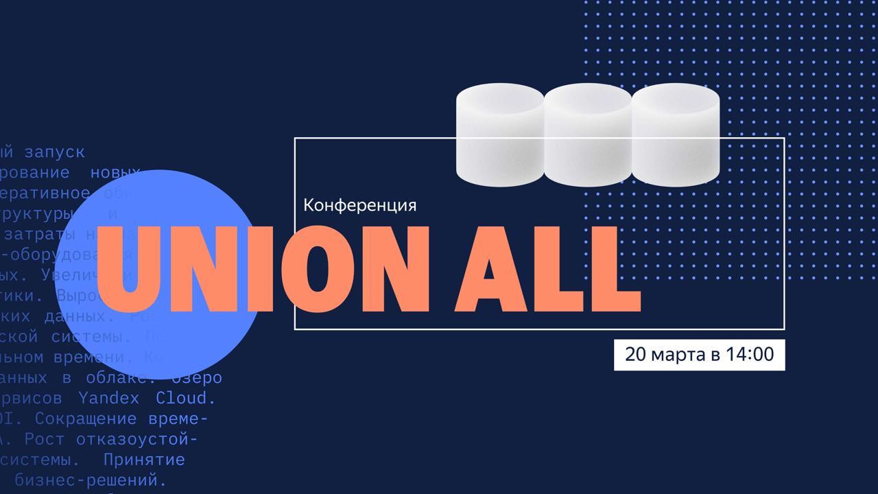 Дата проведения: 20.03.2023.Место проведения: Москва.Онлайн-трансляция: ВК-группа Хабра.Union All — конференция про технологии и работу с данными, которую проводит Yandex Cloud. Мероприятие посвящено облачным технологиям, YandexGPT API и другим актуальным вопросам.Специалисты Yandex Cloud выступят с докладами о работе с YandexGPT, хранении данных и визуализации данных с помощью Yandex DataLens. Эксперты из разных областей поделятся практическими кейсами работы в облаке. Также на конференции можно узнать о новых возможностях Yandex Cloud Platform.На Union All будут интересные доклады и выступления. Самые важные события дня: 14:00 мск — эфир главного доклада. С 15:30 — треки «Технологии».Союз всех технологий ждёт вас!