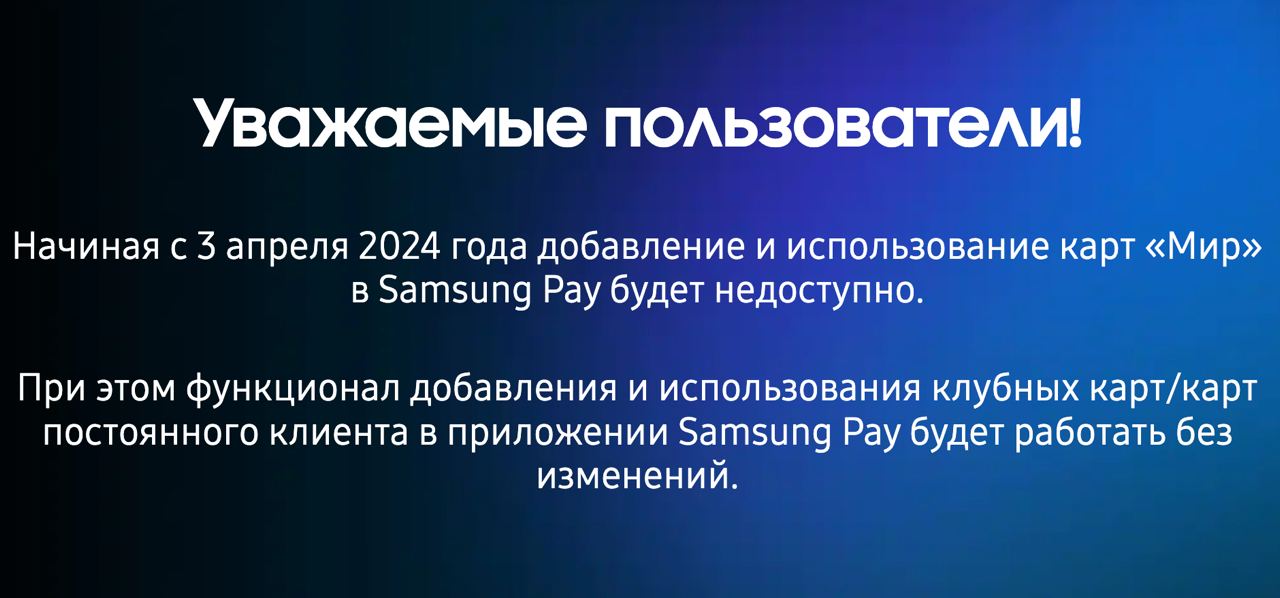 Владельцы карт «Мир», выпущенных российскими банками, больше не смогут оплачивать покупки и услуги в магазинах, которые поддерживают Samsung Pay, с помощью этих карт. Карты, уже добавленные в Samsung Pay, будут автоматически удалены из приложения, а новые карты добавить не получится.