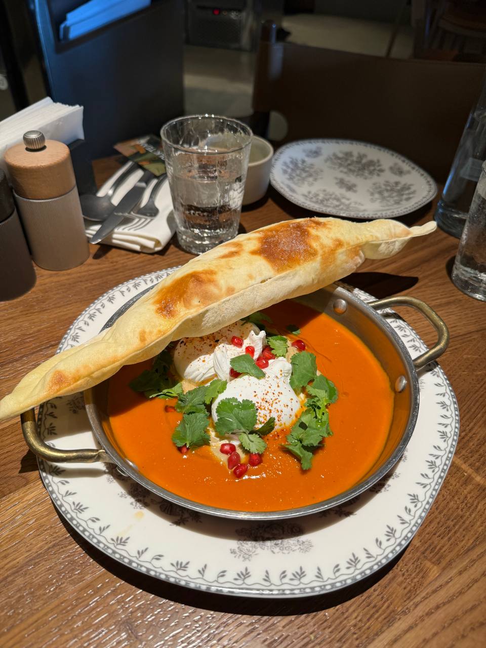 & 8482; Иранская яичница — баклажанная и перечная паста, паста из томата, два яйца-пашот, зерна граната, кинза. В качестве хлеба используется иранский тонкий хлеб.