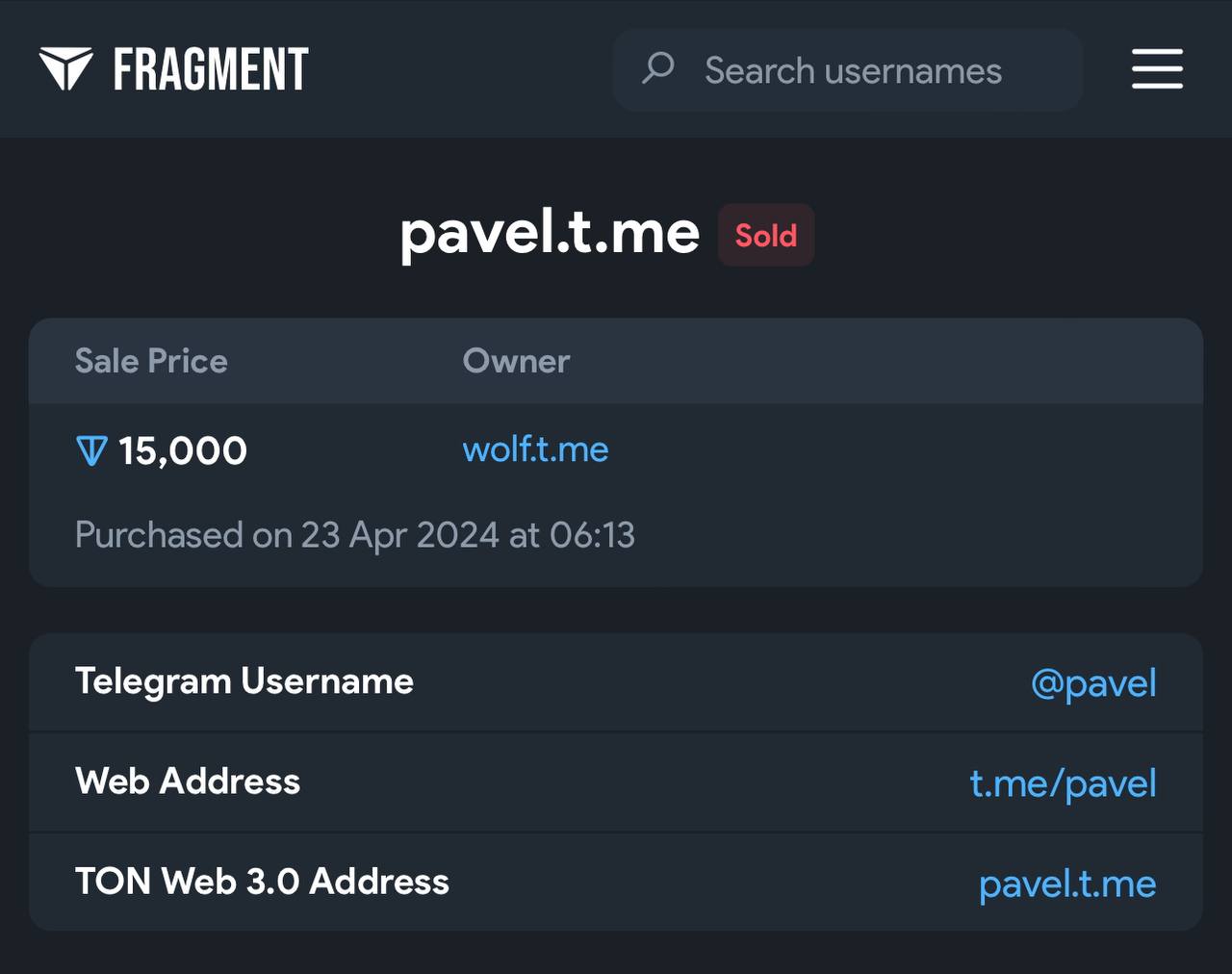 На прошлой неделе мой друг Паша выставил на продажу свой уникальный юзернейм на аукционе fragment. За него развернулась ожесточённая битва между участниками, а выиграл аноним, сделав ставку в размере 15 тысяч TON. Теперь юзернейм принадлежит Павлу Дурову.