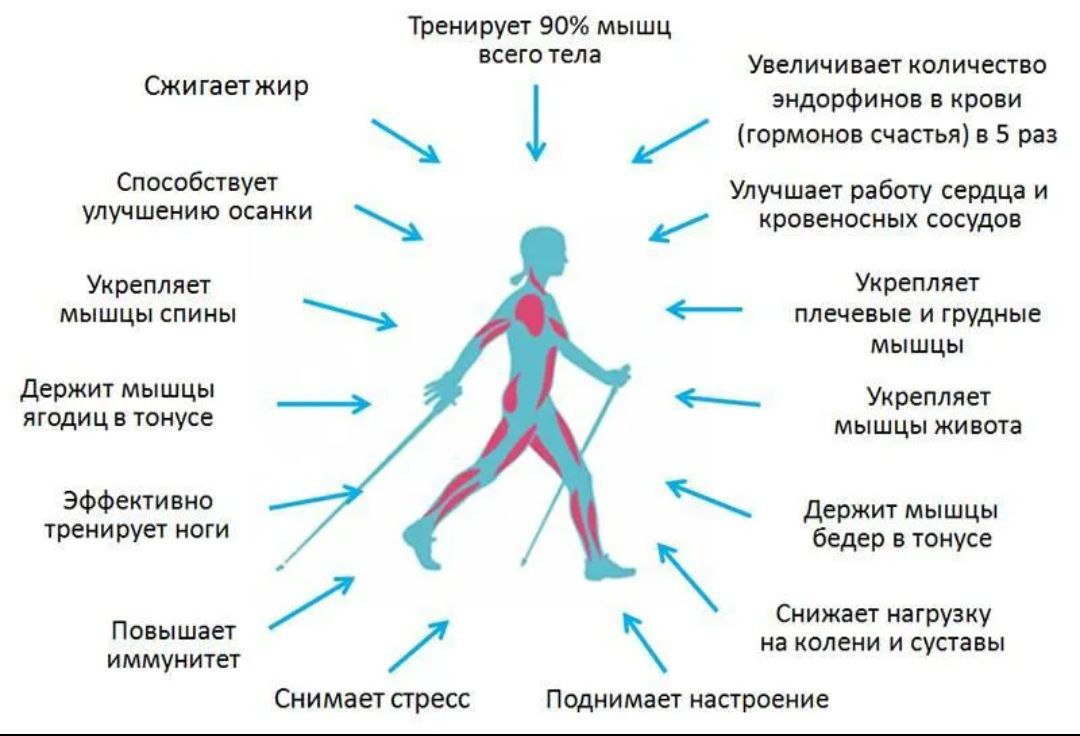 Скандинавская ходьба – один из видов спортивной ходьбы с использованием специальных палок.Её придумал финский лыжник Юхо Хауг в 1940 году. Он заметил, что тренировки лыжников без самих лыж улучшают их физическую форму. С тех пор скандинавская ходьба стала популярной и получила признание как эффективный способ поддержания здоровья и физической активности.Преимущества скандинавской ходьбы:- Подходит для любого возраста и уровня физической подготовки.- Доступна в любую погоду и время года.- Не требует высокой скорости, поэтому подходит для начинающих и пожилых людей.- Улучшает координацию движений и осанку.- Укрепляет мышцы рук, плечевого пояса и ног.Чтобы получить результат, необходимо соблюдать простые правила:- Держать спину ровно.- Двигать правую руку и левую ногу одновременно.- Повторять движение левой рукой и правой ногой.- Сначала ставить ногу на пятку и затем на носок.Продолжительность занятия — от 20 до 25 минут, достаточно 3 занятий в неделю.