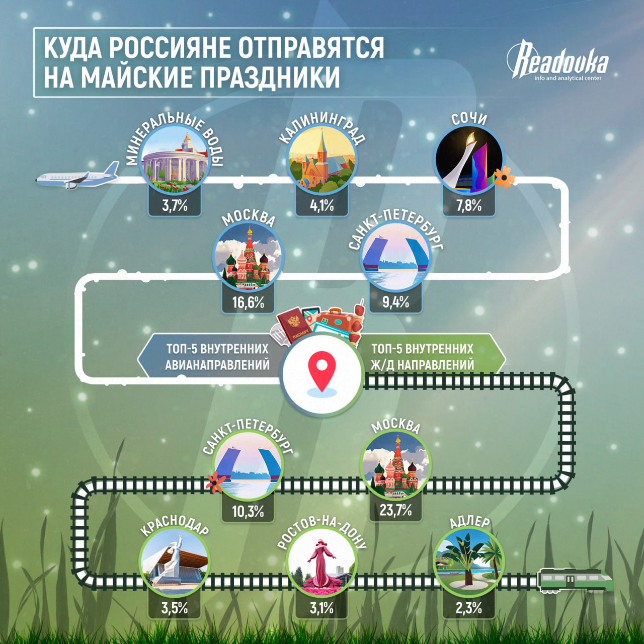 Практически все россияне (82,2 %) выбрали местом отдыха на майские праздники Россию, что не может не радовать. Однако спрос на путешествия внутри страны привёл к нехватке авиабилетов и железнодорожных билетов по наиболее востребованным маршрутам, например, Золотому кольцу России. Больше всего билетов продано в Москву (16,6 % авиабилетов и 23,7 % железнодорожных билетов). На втором месте Санкт-Петербург (9,4 % и 10,3 % соответственно). Доля зарубежных поездок составила всего 3,5 % на дальнее зарубежье и 0,9 % на Европу, но большее предпочтение отдаётся странам постсоветского пространства, например, Узбекистану, Азербайджану и Киргизии.