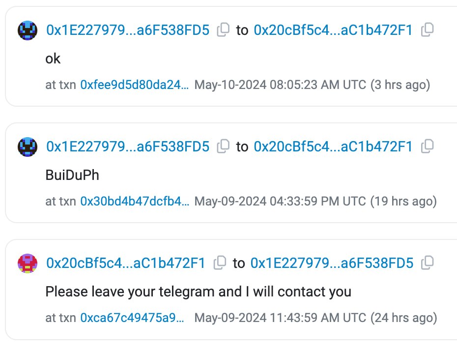 Пострадавший пользователь ранее вступил в переписку с хакером. Он отправлял на кошелёк хакера небольшие переводы с прикреплёнными сообщениями, предлагая вернуть 90 процентов украденной суммы, чтобы избежать раскрытия.