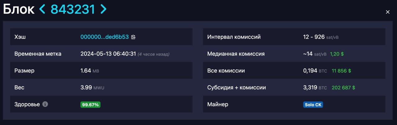 Одиночный майнер мощностью 0,5 Eh/s успешно добыл блок биткоина № 843 231 и получил за него вознаграждение в размере 3,319 BTC, или около 202 тысяч долларов США.