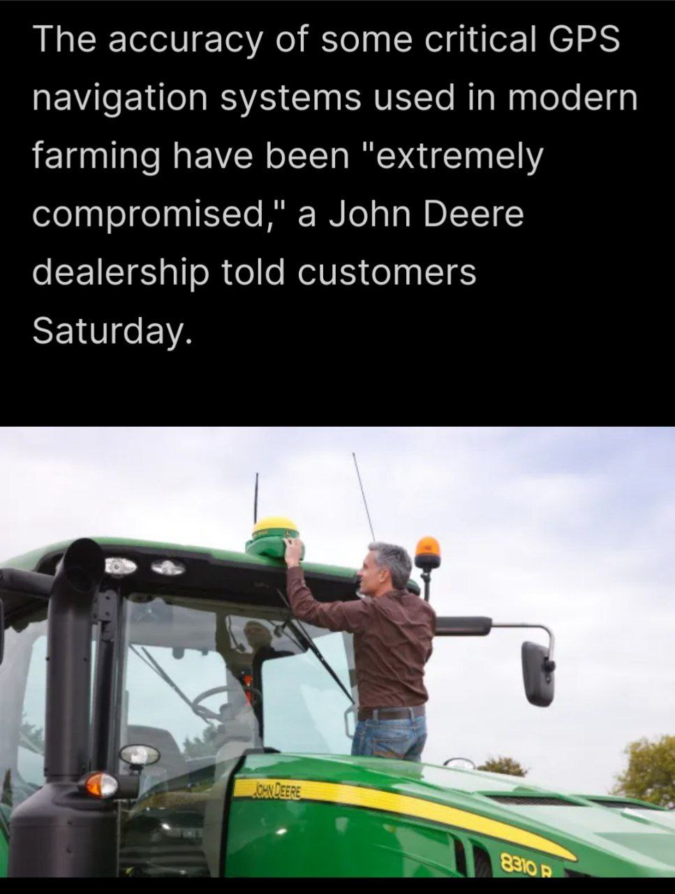 John Deere, производитель тракторов, предупредил о сильном снижении точности GPS.