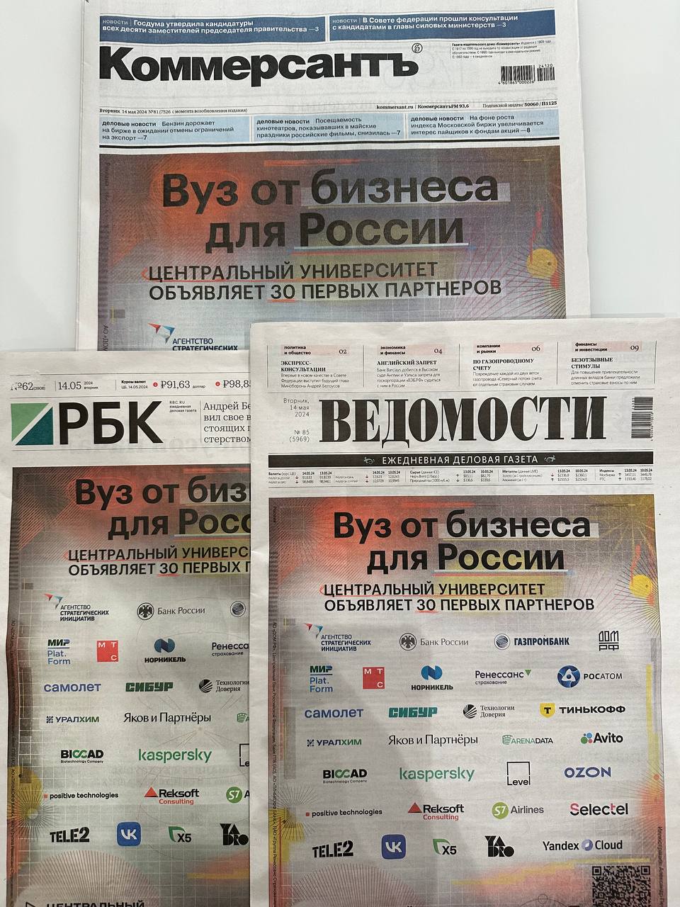 Сегодня обложки трёх ведущих деловых изданий — «Коммерсантъ», РБК, «Ведомости» — вышли с анонсом Центрального университета.