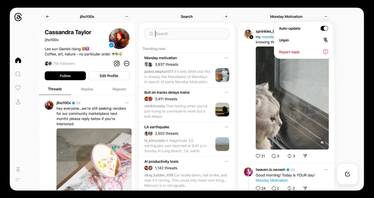 В социальной сети Threads, принадлежащей Meta, начали тестирование пользовательского интерфейса, выполненного в стиле программы для работы с несколькими лентами сообщений — TweetDeck.