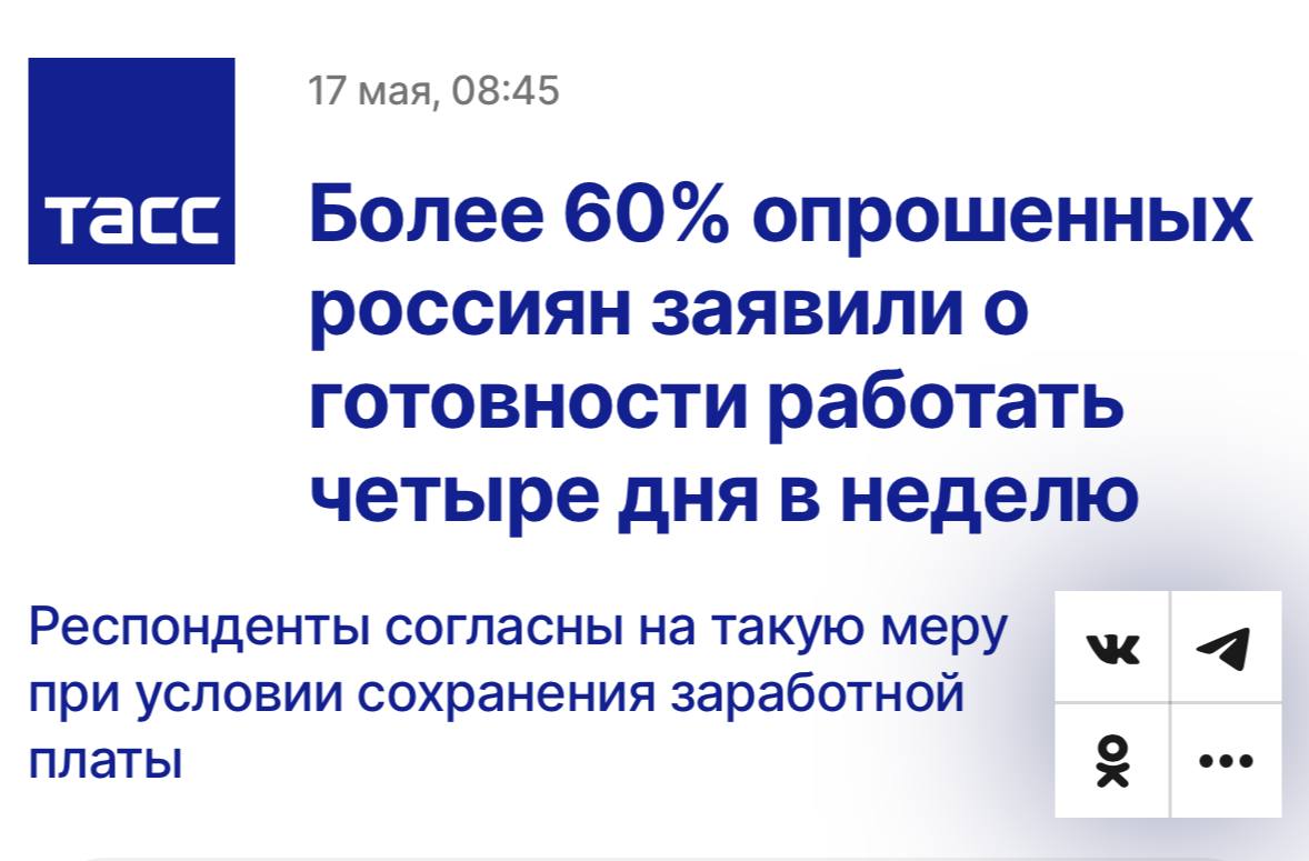 Большинство россиян хотели бы работать по четыре дня в неделю при сохранении текущей зарплаты (60,9%).