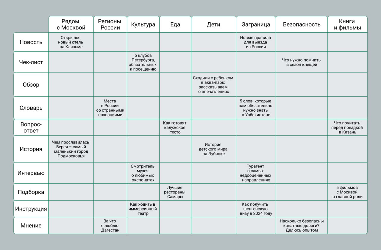 Каждая ячейка представляет собой идею контента, который можно создать для определённо й темы и в определённом формате.