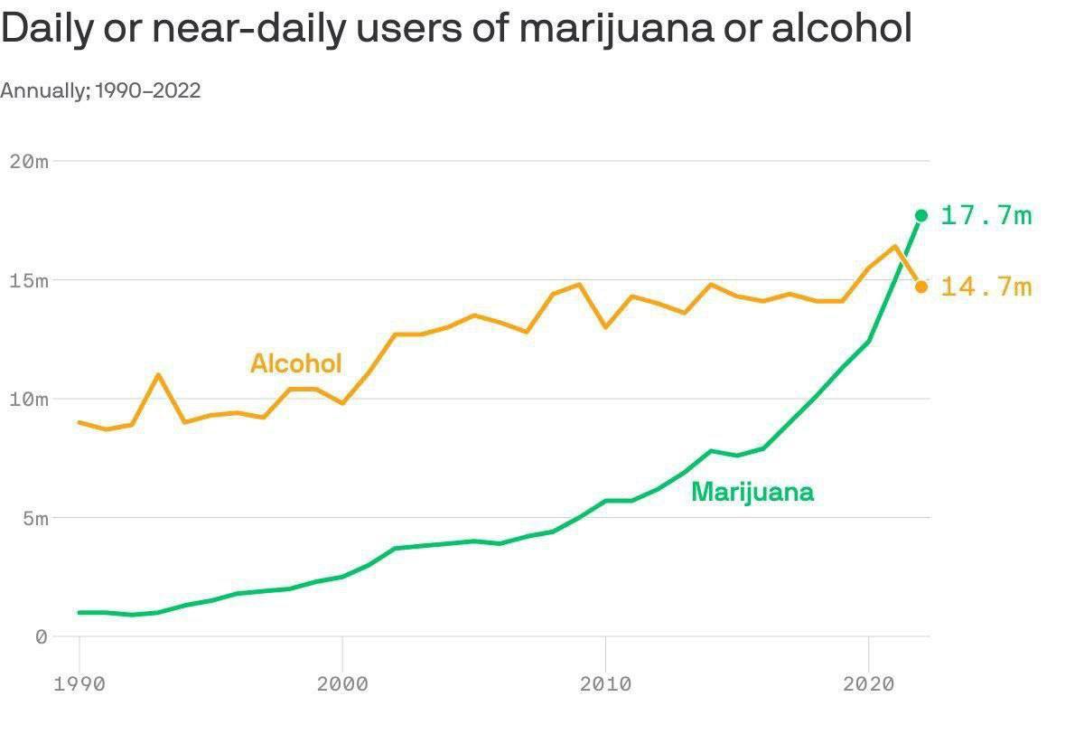 Американские исследователи подсчитали, что в 2022 году число жителей США, употреблявших марихуану на ежедневной основе, впервые превзошло число тех, кто пил алкоголь так же часто.