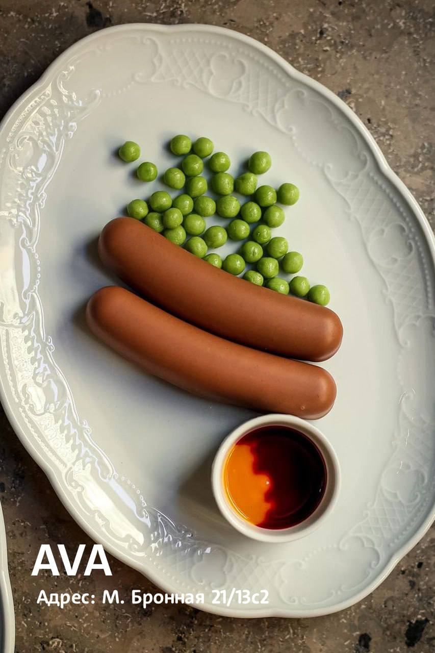 - AVA — творожные сырки «Сосиски» с брауни, вареной сгущёнкой, нежным творогом, покрытые молочным шоколадом и соусом из фисташек и миндаля с пюре из клубники и манго.