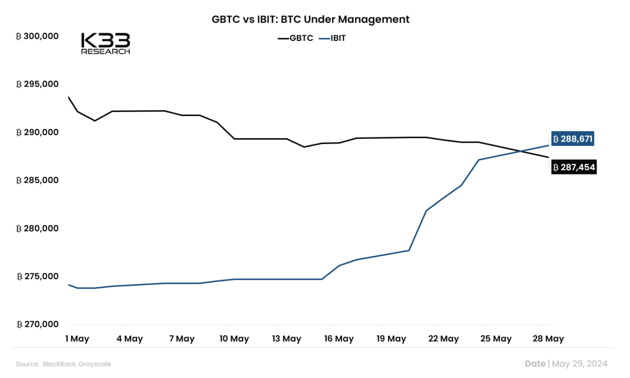 По количеству биткоинов в управлении фонд IBIT обошёл GBTC от компании Grayscale, который более 10 лет был самым крупным из существующих биткоин-фондов. После преобразования GBTC в полноценный ETF, в январе, инвесторы вывели из фонда более половины активов.