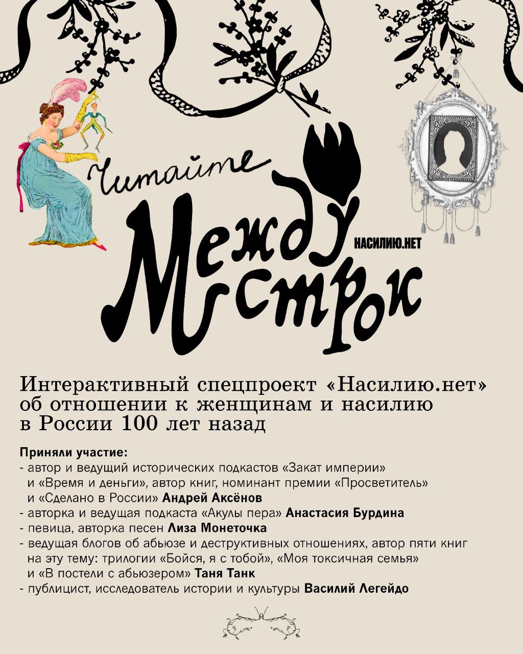 Проект «Между строк», выпущенный Центром «Насилию.нет», представляет собой мультимедийную историю, охватывающую исторические события и литературные произведения, которые проливают свет на положение женщин и проблемы гендерного насилия в России на рубеже XIX–XX веков и в ранний советский период.