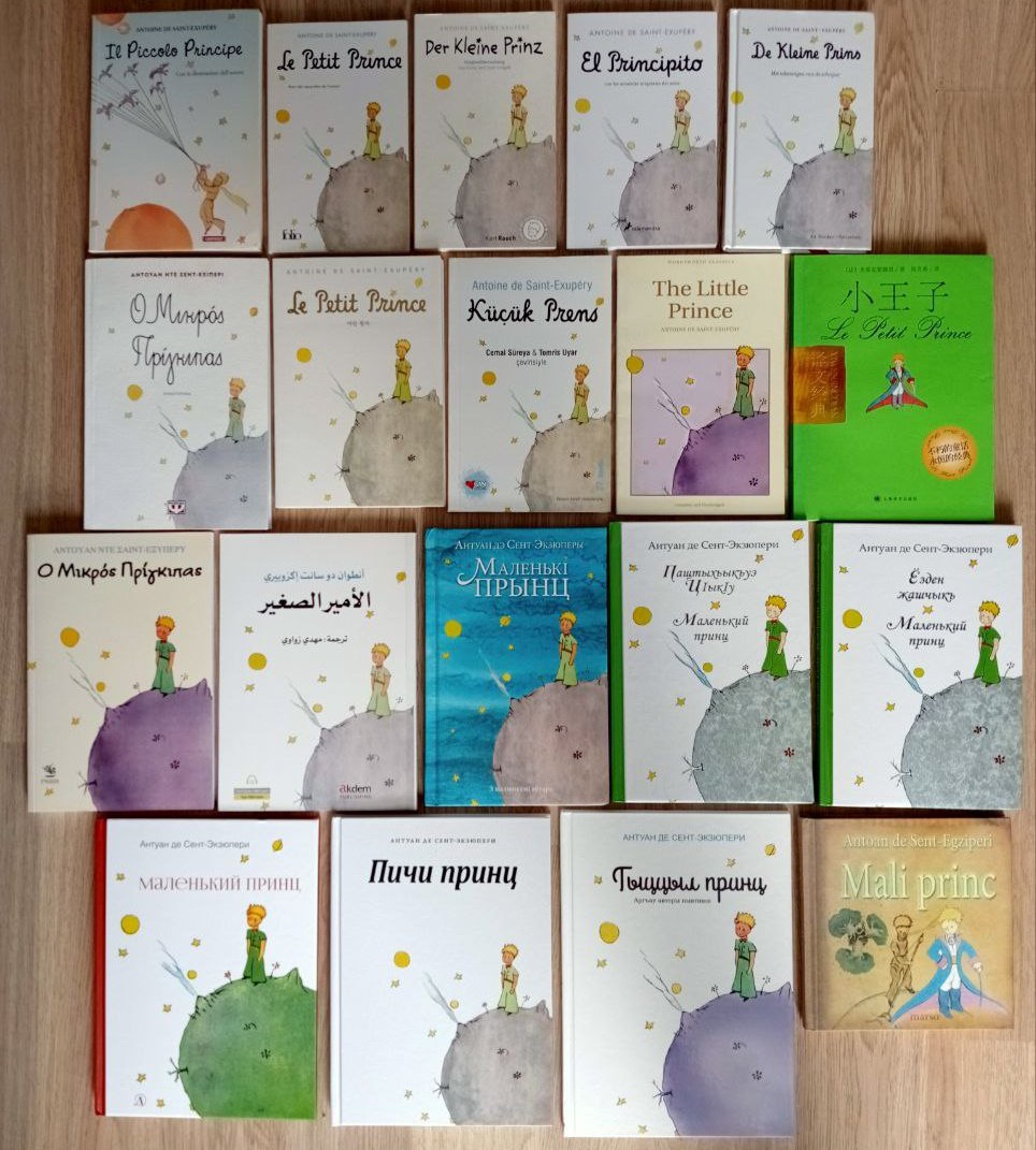 Чтобы ответ не следовал сразу за вопросом, покажу маленьких принцев — девятнадцать книг на восемнадцати языках. Следим по строчкам слева направо и сверху вниз: