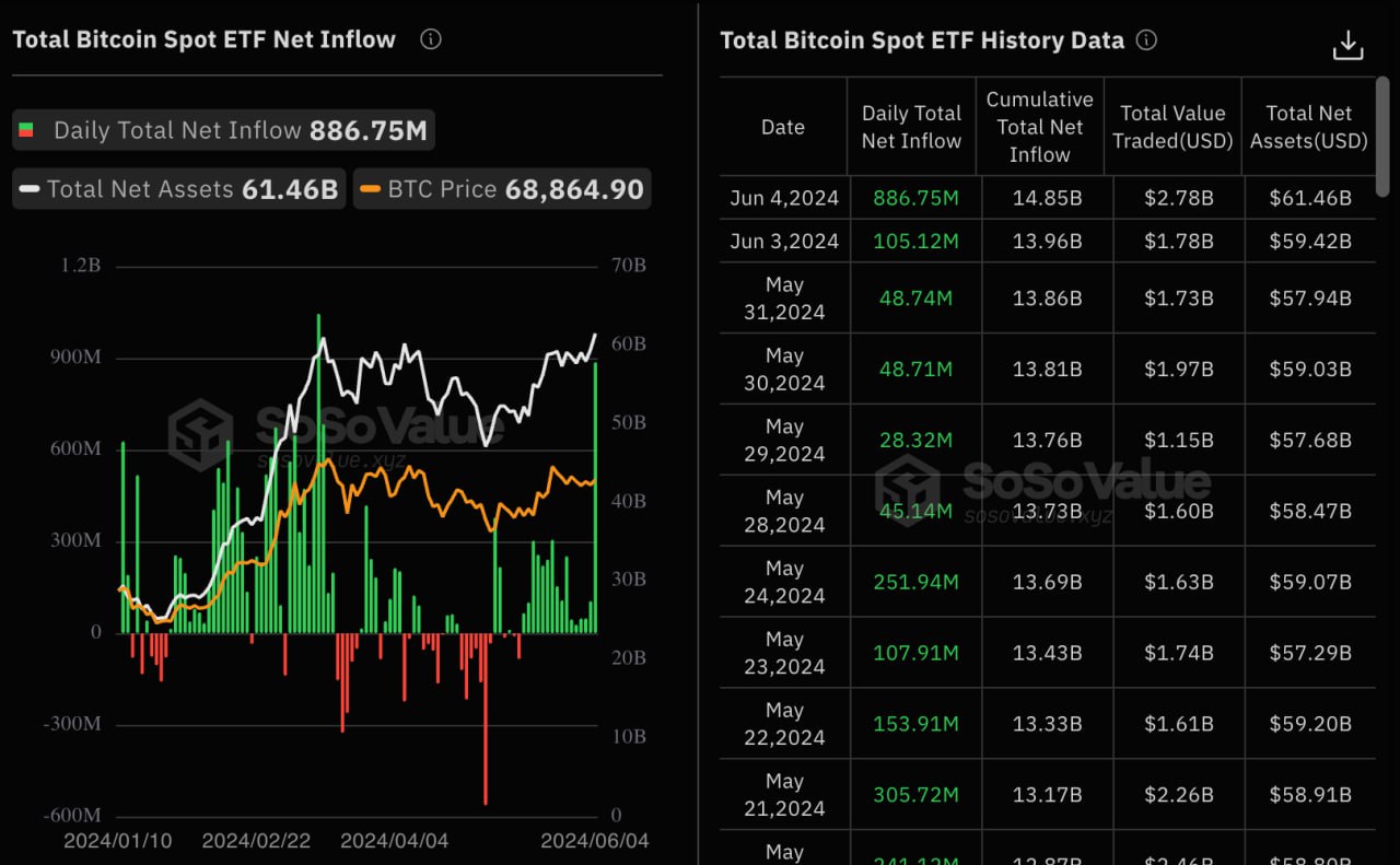 По результатам торговой сессии 4 июня 2023 года зафиксирован второй по величине приток капитала в американские спотовые биткоин-биржевые фонды (ETF) с момента их запуска — 887 миллионов долларов. Это делает текущую сумму сумму биткоинов, находящихся под управлением фондов, равной более 61 миллиарда долларов, что составляет 4,43 процента от общего объёма существующих биткоинов.
