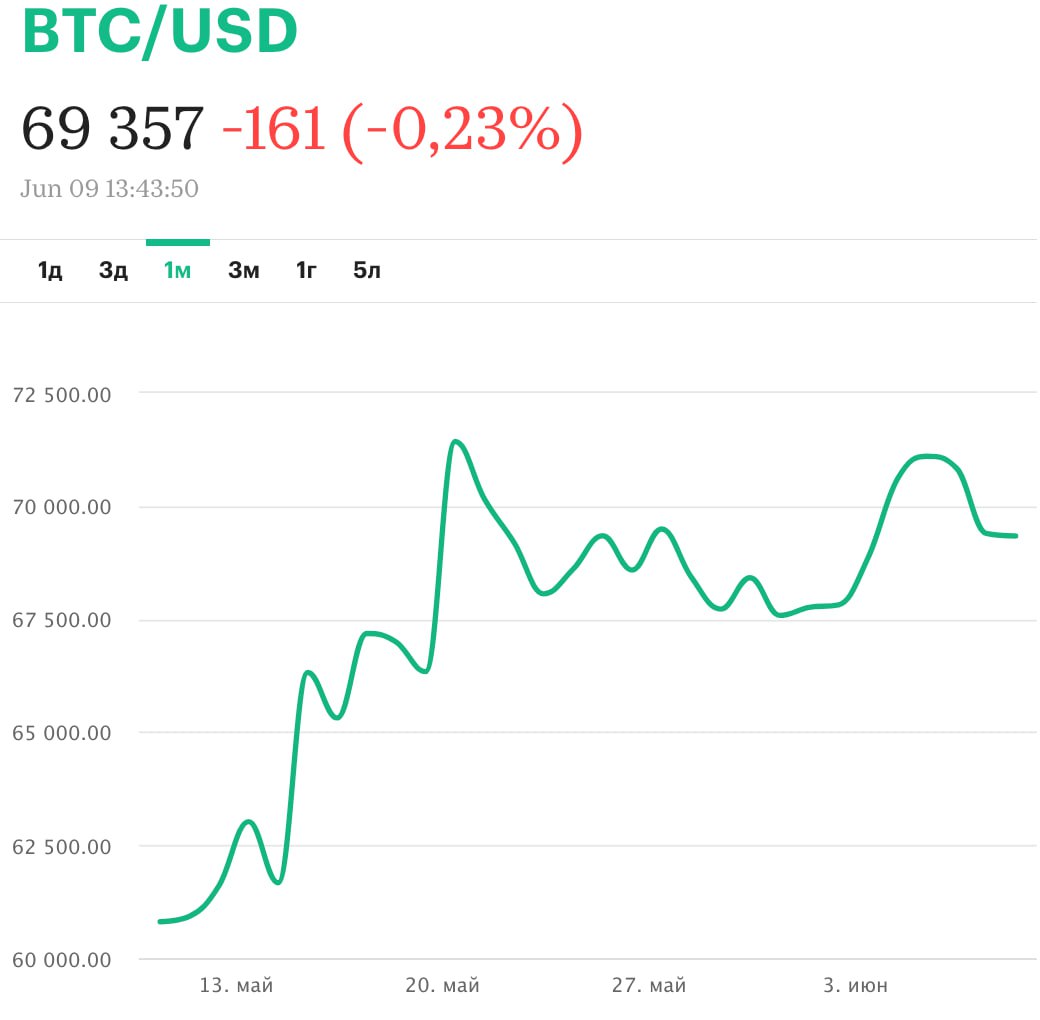 9 июня биткоин торговался около отметки в $69 300, и его цена выросла примерно на 2,5% за прошедшую неделю.