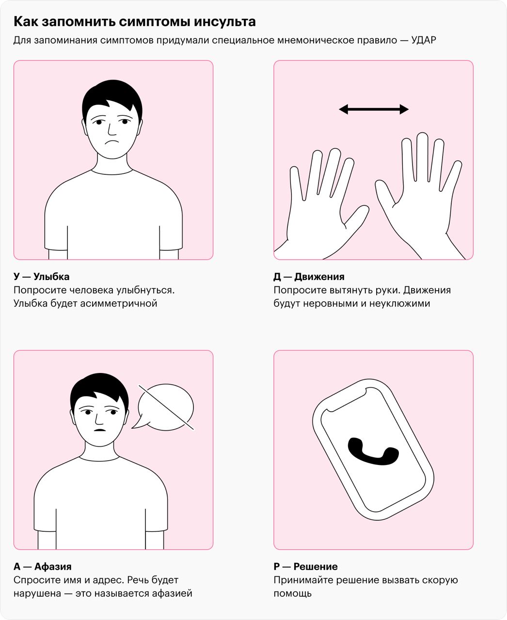 Существует мнемоническая техника «УДАР», которая помогает запомнить симптомы инсульта: