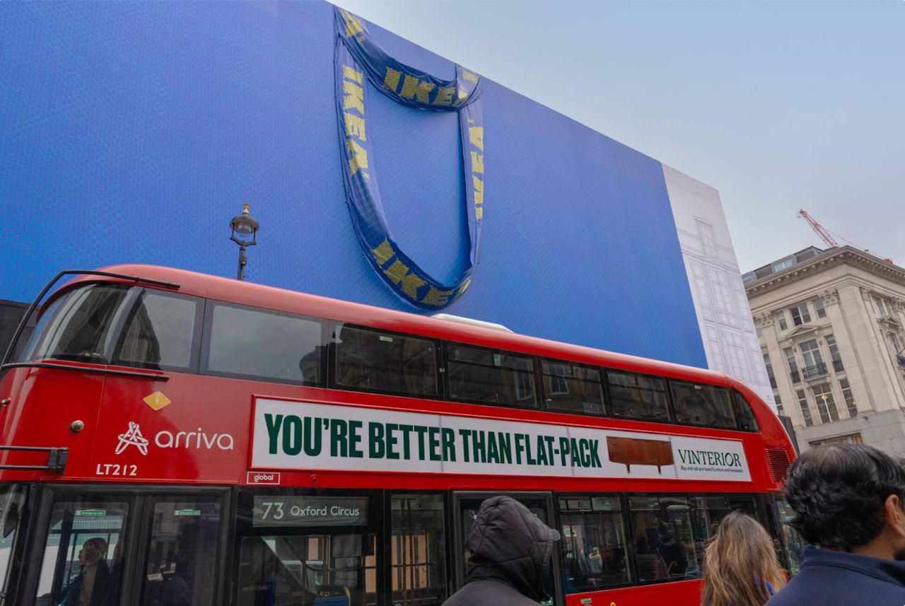 Также Vinterior использует слоган «Ты лучше разборной мебели», который, вероятно, должен привлечь внимание к своей продукции, но также может быть воспринят, как критика IKEA. Слоган будет проезжать мимо неоткрытого магазина IKEA на Оксфорд-Стрит каждые 10 минут, что может создать шумовое загрязнение для конкурирующего бренда.