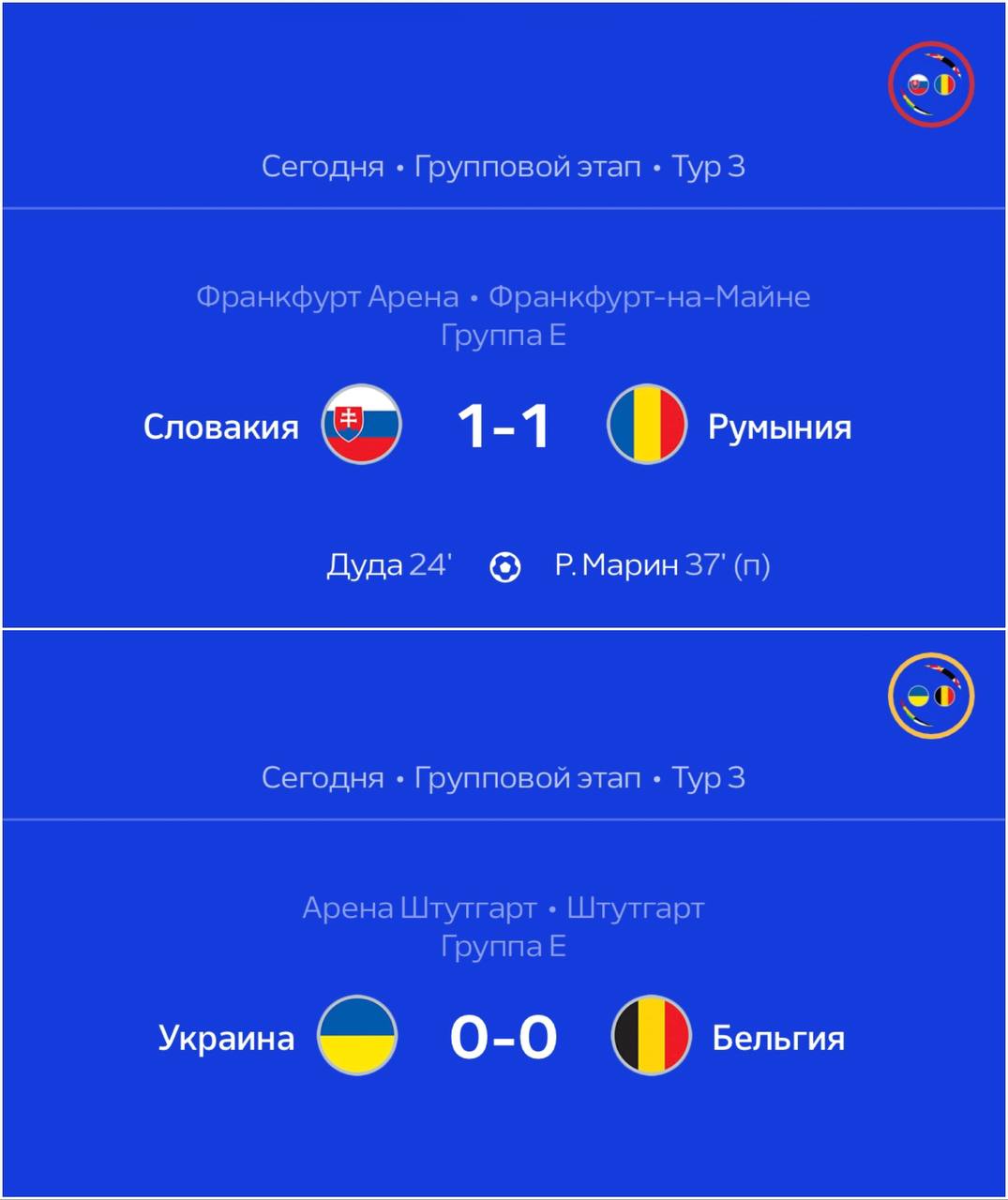 Сборная Румынии со счётом 1:1 сыграла вничью со сборной Словакии в рамках третьего тура группового этапа на чемпионате Европы в Германии. Обе команды прошли в плей-офф. Первое место в группе заняла сборная Румынии. Её соперник по 1/8 финала определится позднее. Второе место заняла сборная Бельгии, её соперник по 1/8 финала — сборная Франции. Третье место заняла сборная Словакии. Соперник по следующей стадии турнира для неё определится позднее. Сборная Украины выбыла с Евро.
