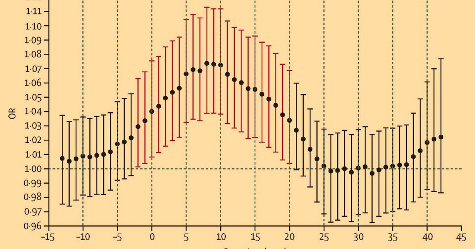 «Прохлада во время беременности особенно в первой её половине может оказаться полезной для здоровья будущего ребёнка. Американские учёные сопоставили метеосводки и регистры онко-заболеваний в Калифорнии и выяснили, что высокая температура воздуха, связанная с последующим повышенным риском развития острого лимфобластного лейкоза, достигает максимума на восьмой неделе беременности.»