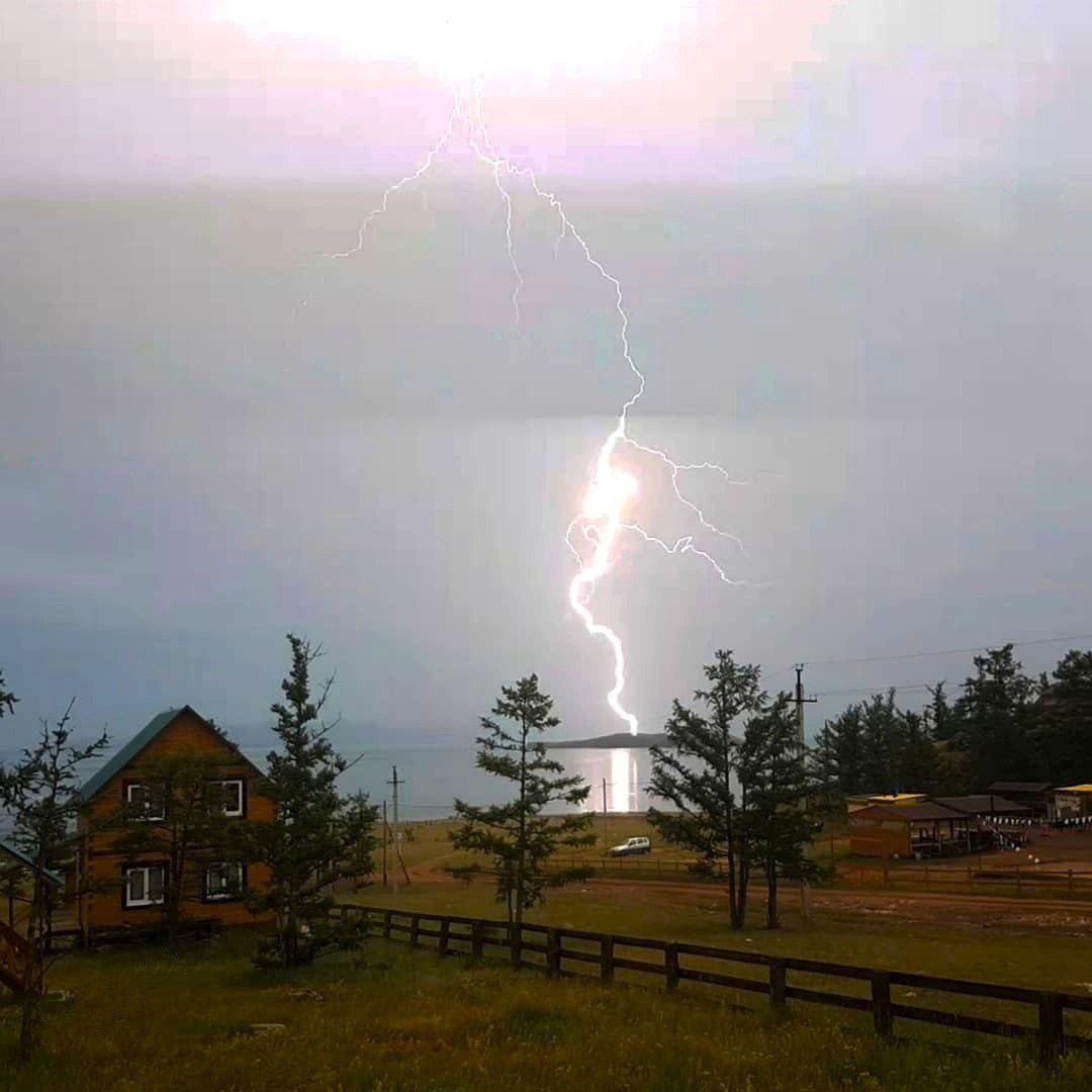 Эффектный удар молнии в один из островов на Байкале.