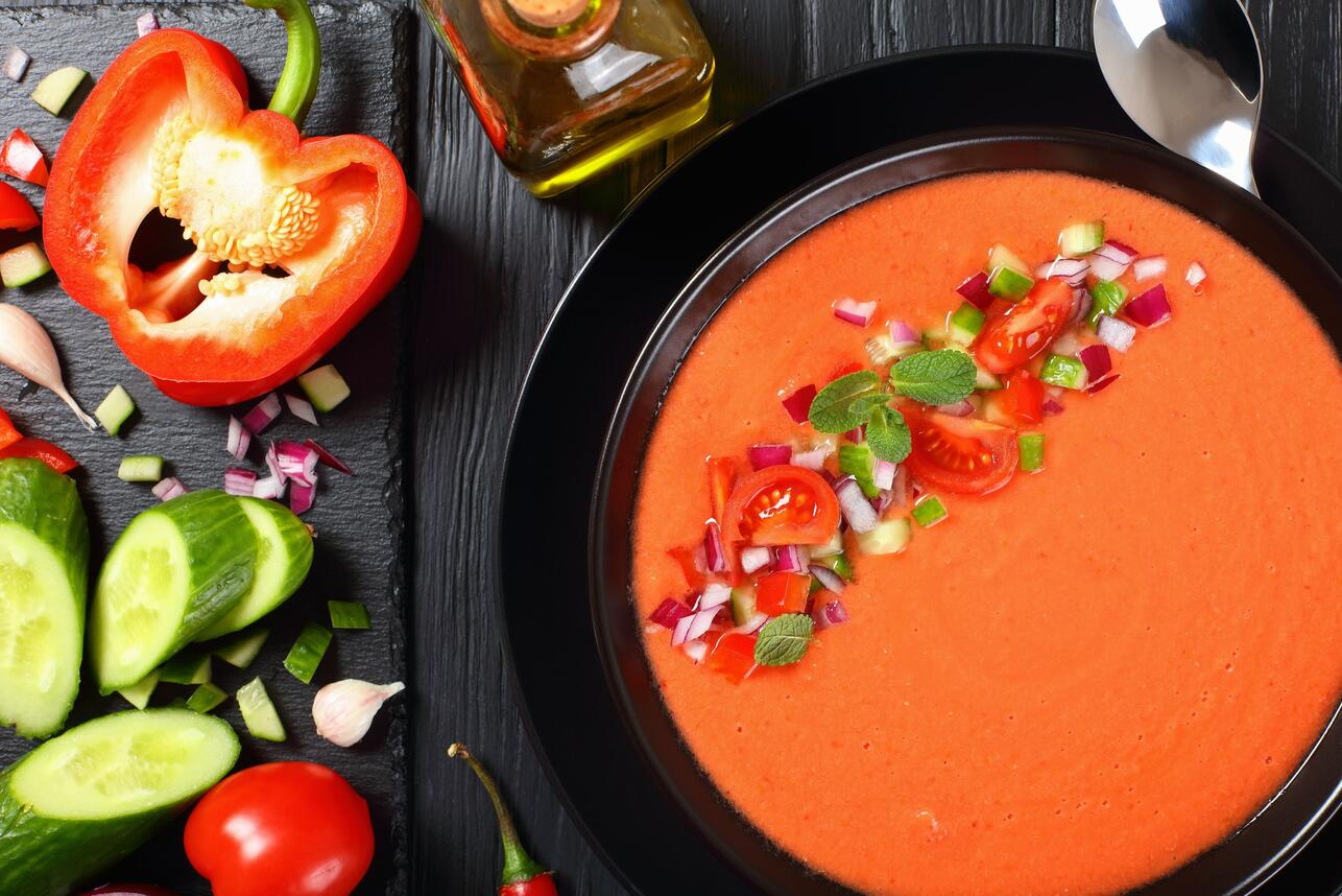 Великолепный летний гаспачо начинается со спелых помидоров. Пикантный холодный суп родом из Испании вряд ли оставит кого-то равнодушным.