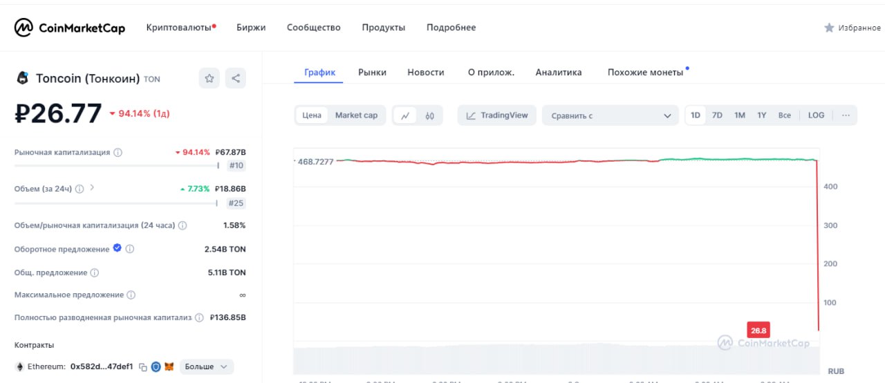 После задержания создателя криптовалюты TON Павла Дурова, стоимость криптовалюты упала на 93% всего за несколько минут. Однако цена на TON на биржах осталась прежней.