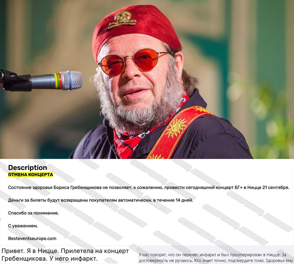 Концерт Бориса Гребенщикова, который должен был состояться 21 сентября в Ницце, отменили из-за состояния здоровья музыканта. По предварительной информации, у Бориса Гребенщикова проблемы с сердцем.