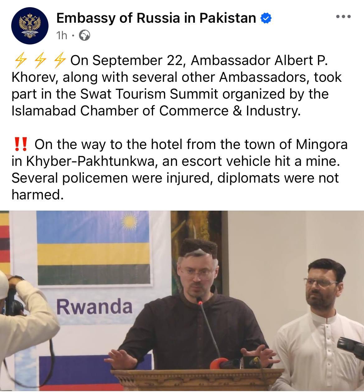 Автомобиль сопровождения, в котором находился посол России Альберт Хорев, подорвался на мине в Пакистане.