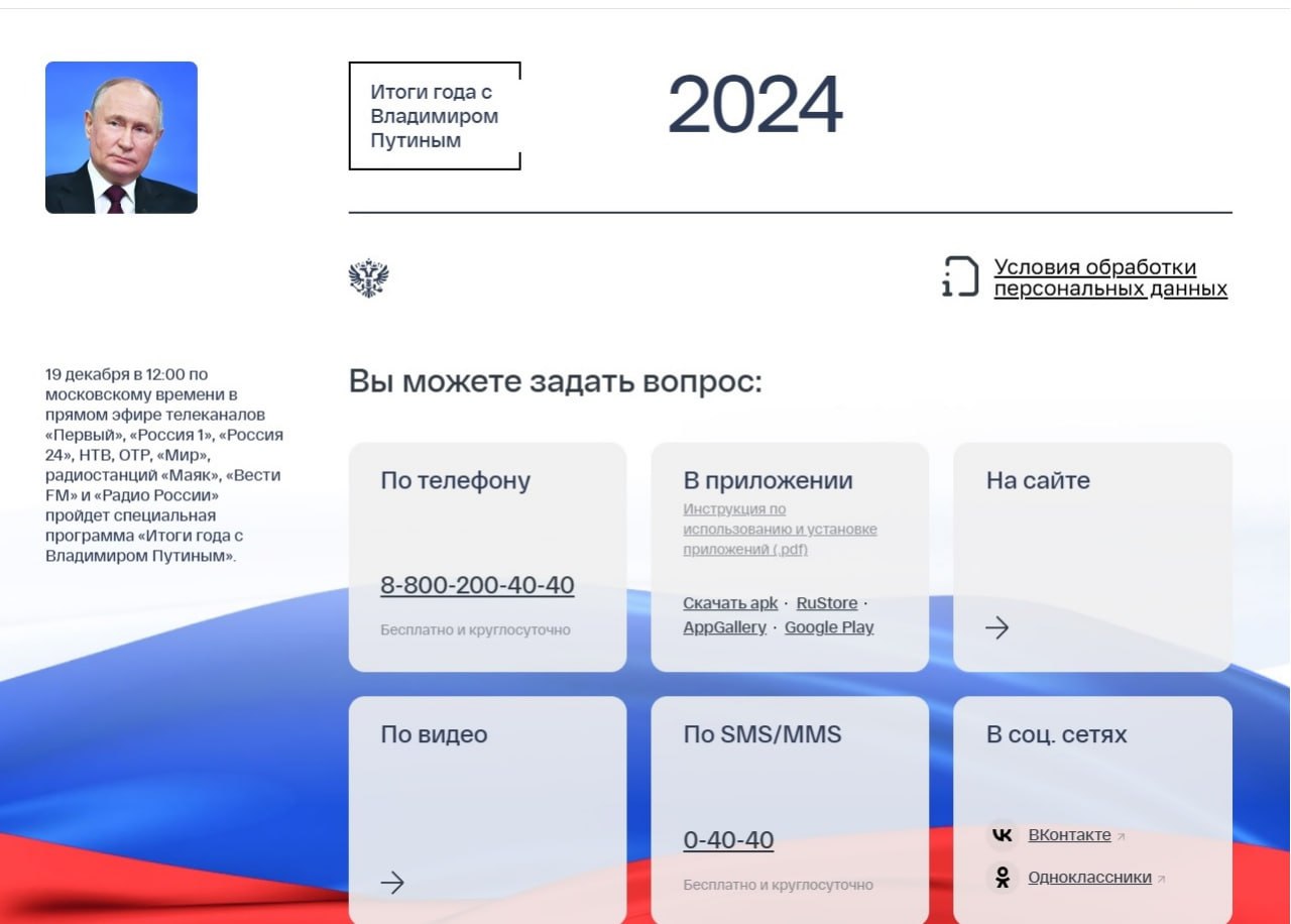 Обратиться к главе государства можно и по телефону 8-800-200-40-40. Есть возможность видеозвонка через сайт, также задать вопрос можно посредством мобильного приложения. Текстовые и видеовопросы президенту могут быть отправлены и через соцсети «ВКонтакте» и «Одноклассники».